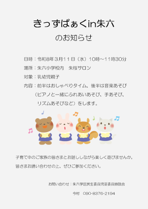きっずぱぁくin明倫には、当時の聚楽保育所(じゅらく児童館の建物の1階)の保育士さんの紹介によって、2014~2017の毎年のクリスマス会の時に参加させていただき、ピアノを弾かせていただきました。